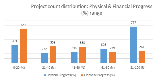• Physical and financial progress broadly move in tandem, with a large number of projects clustered at the initial (0–20%) and advanced (81–100%) stages, indicating a pipeline of newly-started projects alongside many nearing completions. While physical progress exceeds financial progress in the 81–100% range, financial progress is relatively higher in the early stages, reflecting upfront expenditure patterns in project implementation.