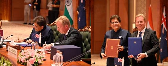 New Delhi. ; India and New Zealand today signed the India- New Zealand Free Trade Agreement (IN- NZ FTA) at Bharat Mandapam, New Delhi, under the vision and leadership of Hon’ble Prime Minister Shri Narendra Modi to strengthen India’s global economic partnerships. The Agreement was signed by Union Minister of Commerce and Industry Shri Piyush Goyal and New Zealand’s Minister for Trade and Investment Hon. Todd McClay.